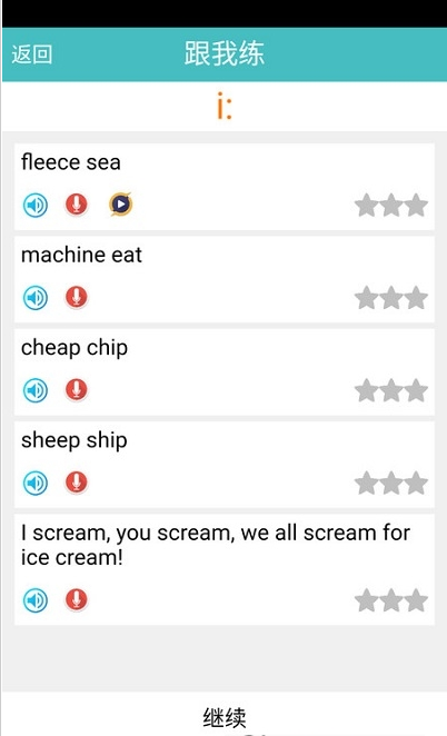 提供单词、短语、绕口令等素材的跟读练习,能够让你在这里得到更好的学习效果,系统会根据发音准确度给出星级评分;