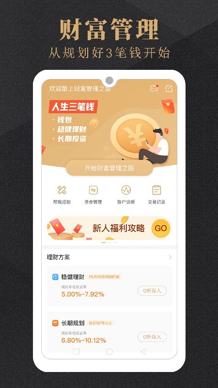 【财富管理】独创"三笔钱"理财体系,科学规划短期消费、中期保值、长期增值资金,让每一分钱都发挥最大价值。系统会根据用户风险偏好自动生成个性化配置方案。