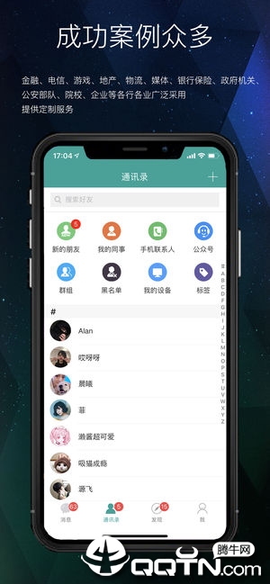 通讯录,支持好友验证或不验证、二维码、标签分组、拉黑、我的同事、公众号、多点登录、我的手机发消息给我的电脑等。智能分组功能可以根据通讯频率自动排序,快速找到常用联系人。
