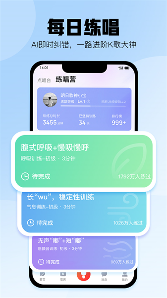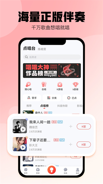 酷狗唱唱K歌是一款专为音乐爱好者打造的沉浸式K歌应用。在这里,你可以享受海量正版高品质伴奏,体验专业级音效处理技术,让每一次演唱都如同置身录音棚。创新的智能评分系统能精准分析你的演唱技巧,而独特的PK擂台模式则让你与全国歌友一较高下。无论是想独自练歌还是与好友互动合唱,酷狗唱唱都能满足你的需求。更有趣的是,你还能通过演唱赚取唱豆,将音乐热情转化为实际收益。