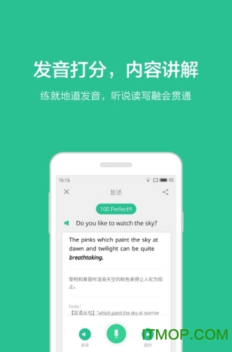 拒绝单一跟读模式,提供逐句中文翻译,让你听音复述。跟读模仿阶段还有智能打分,纠正你的发音错误,让你事半功倍。系统采用先进的语音识别技术,能精准识别发音中的细微差别,并提供可视化波形图对比。还可以将你的发音分享给朋友,学习路上不孤单~更有社区互动功能,可以和全国各地的学习者一起切磋进步。