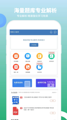网络工程师题库APP是一款专为网络工程师考试打造的综合性学习平台,汇聚海量优质学习资源,为用户提供一站式备考解决方案。无论您是初学者还是资深从业者,都能在这里找到适合自己的学习内容。APP内包含全面覆盖考试大纲的题库系统、专业权威的学习资料、高清讲解视频、资深教师团队指导、高仿真模考试卷以及历年真题汇编,每一道题目都配有详细解析,帮助您深入理解知识点,构建完整的知识体系。