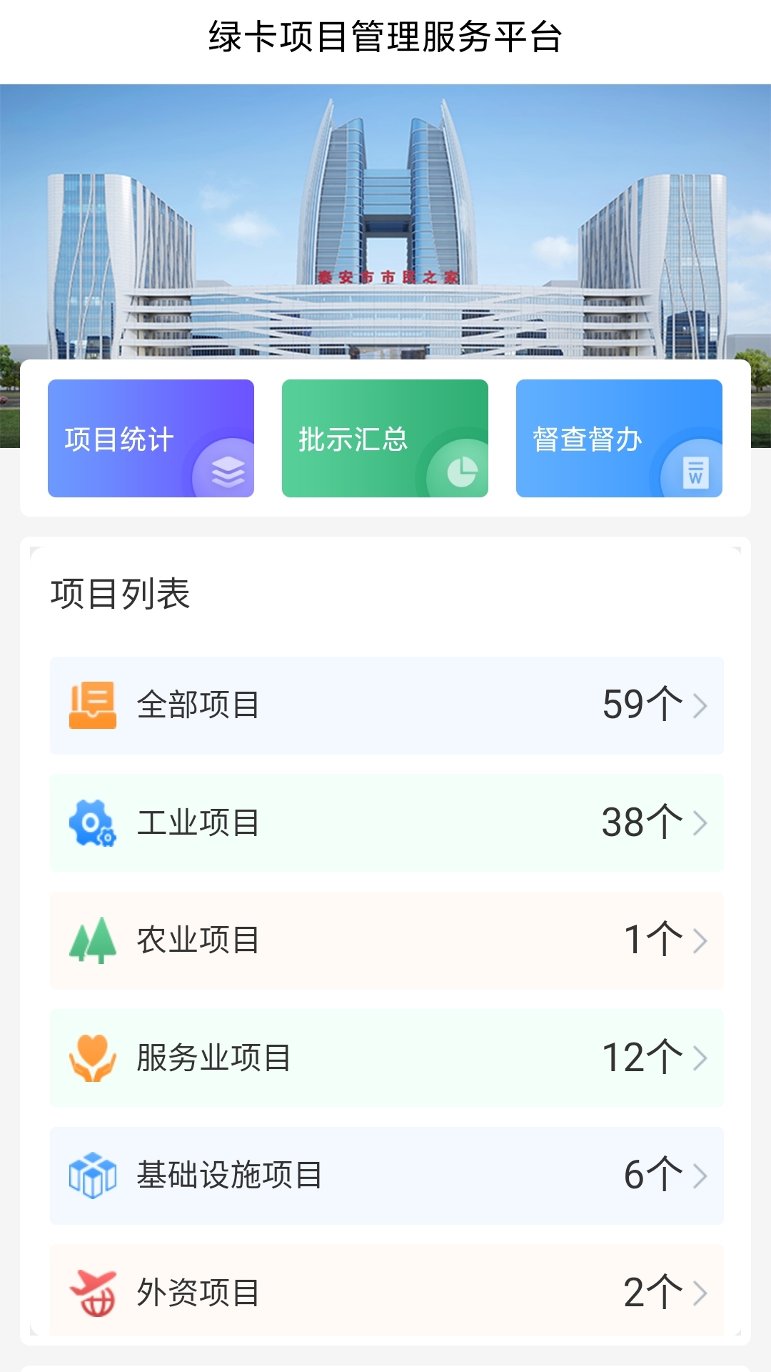 全部项目:展示泰安市所有正在进行的绿卡项目,可按时间、进度等多维度筛选查看。