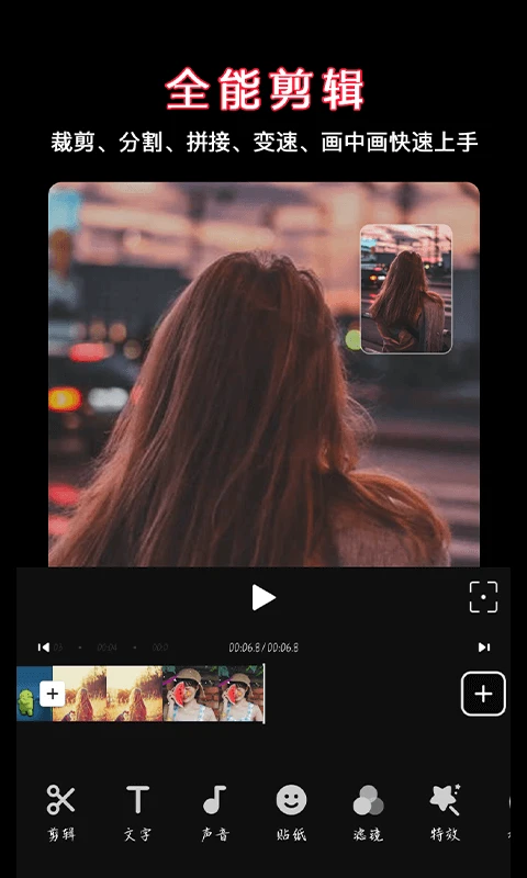 一键轻松剪辑热门短视频、视频裁剪、视频拼接、视频抠图、转场特效、制作音乐相册等等;