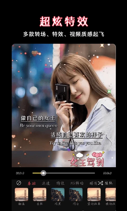 「特效滤镜」胶片、复古、梦幻等多种魔法滤镜,让你的视频变的更加特别。