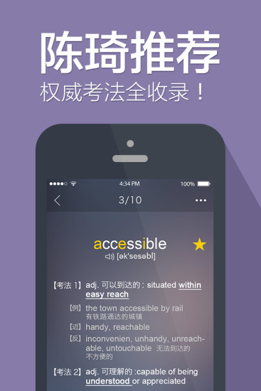 小巧的英汉字典:学习时能及时查阅不认识的单词,支持离线使用,方便考生在任何环境下快速查找单词释义和例句,加深理解。