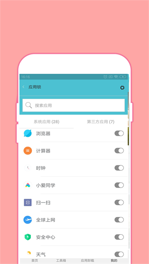 -安卓手机上的应用都可以加密保护,无论是系统软件还是第三方软件,选择所需应用,一键点击开启加密。特别针对相册和文件管理器开发了深度加密模式,防止重要资料外泄。