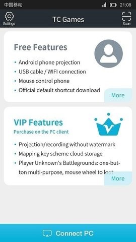 手机端安装完成后,会自动连接到tcgames,连接成功后即可开始使用各项功能。