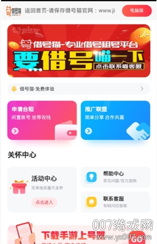 租号专用上号器(借号猫)是一款专为游戏玩家打造的账号租赁平台,致力于为用户提供安全、便捷的游戏账号共享服务。无论你是想体验高端账号的畅快操作,还是临时需要特定游戏角色,这款软件都能满足你的需求。平台汇集了当前最火爆的热门游戏账号资源,包括但不限于《王者荣耀》《和平精英》《英雄联盟》《穿越火线》《球球大作战》《QQ飞车》等,覆盖端游和手游两大领域,让玩家轻松找到心仪的游戏账号。