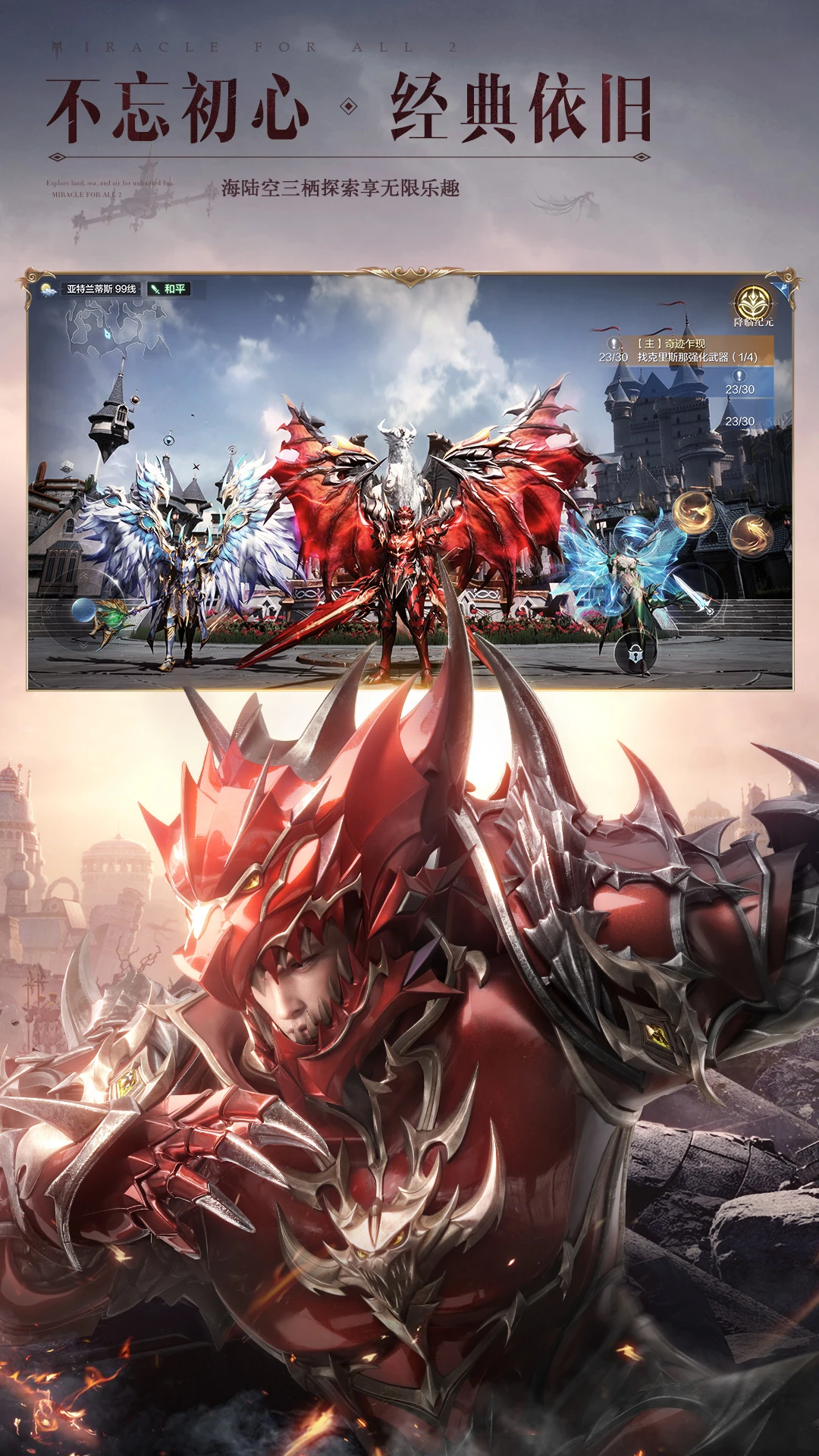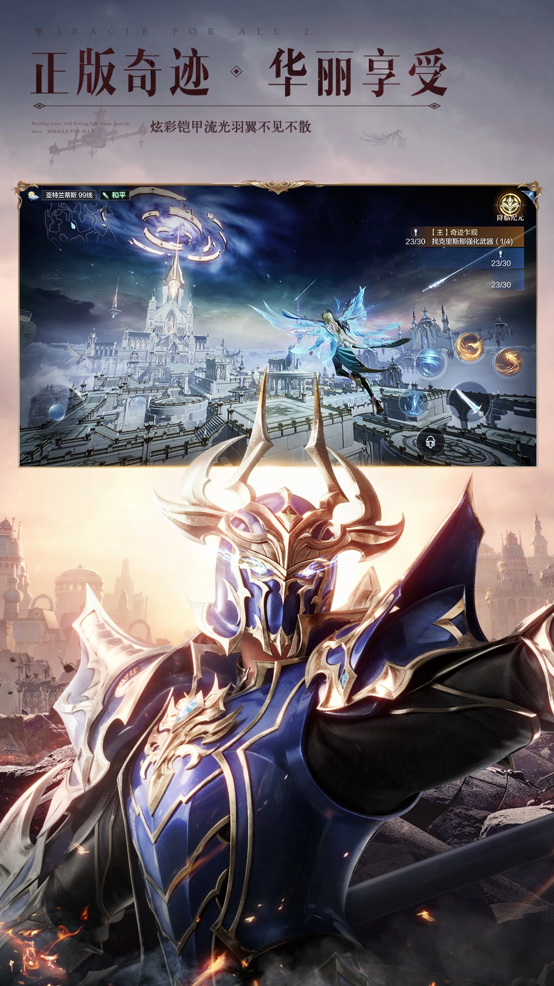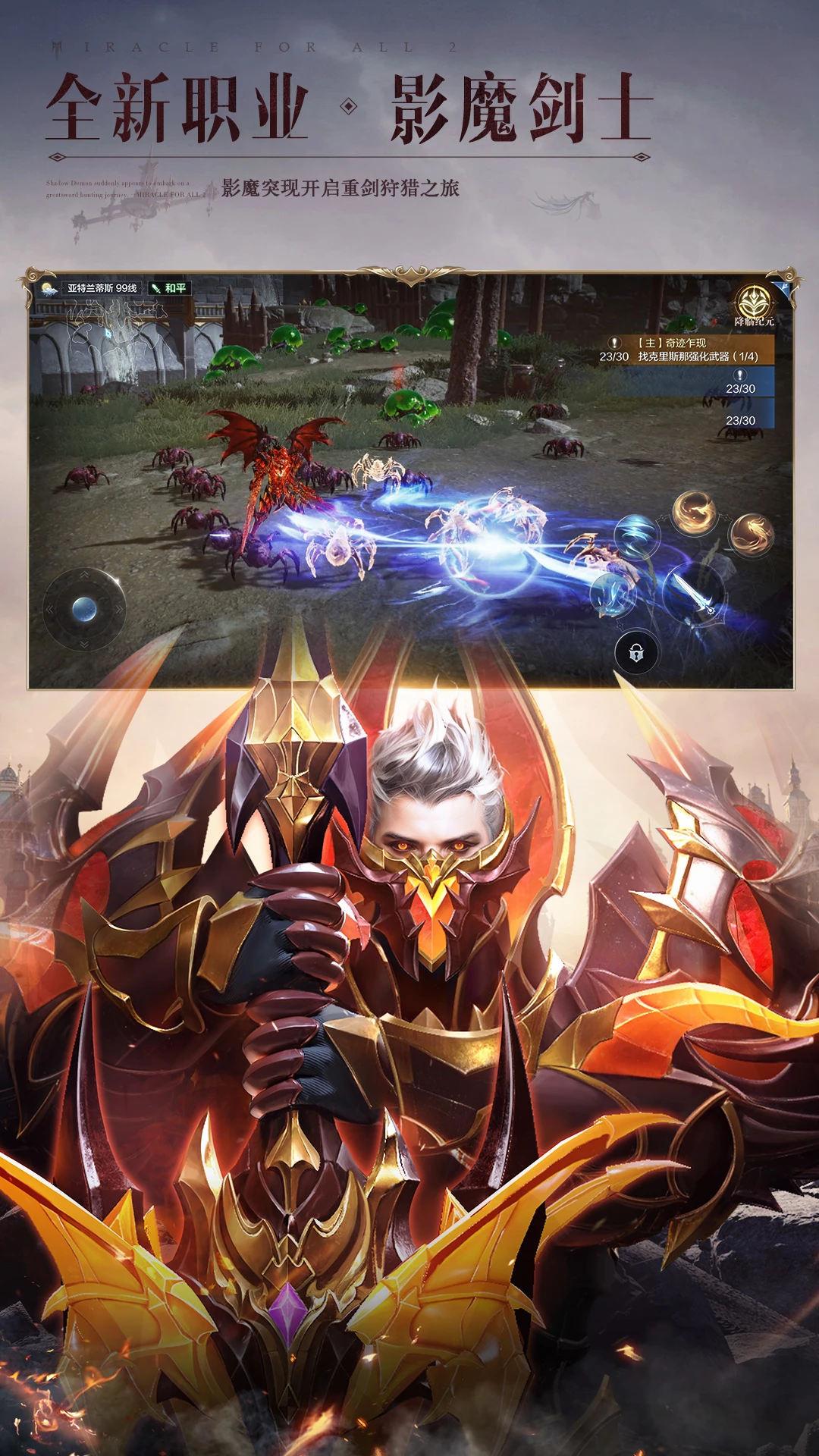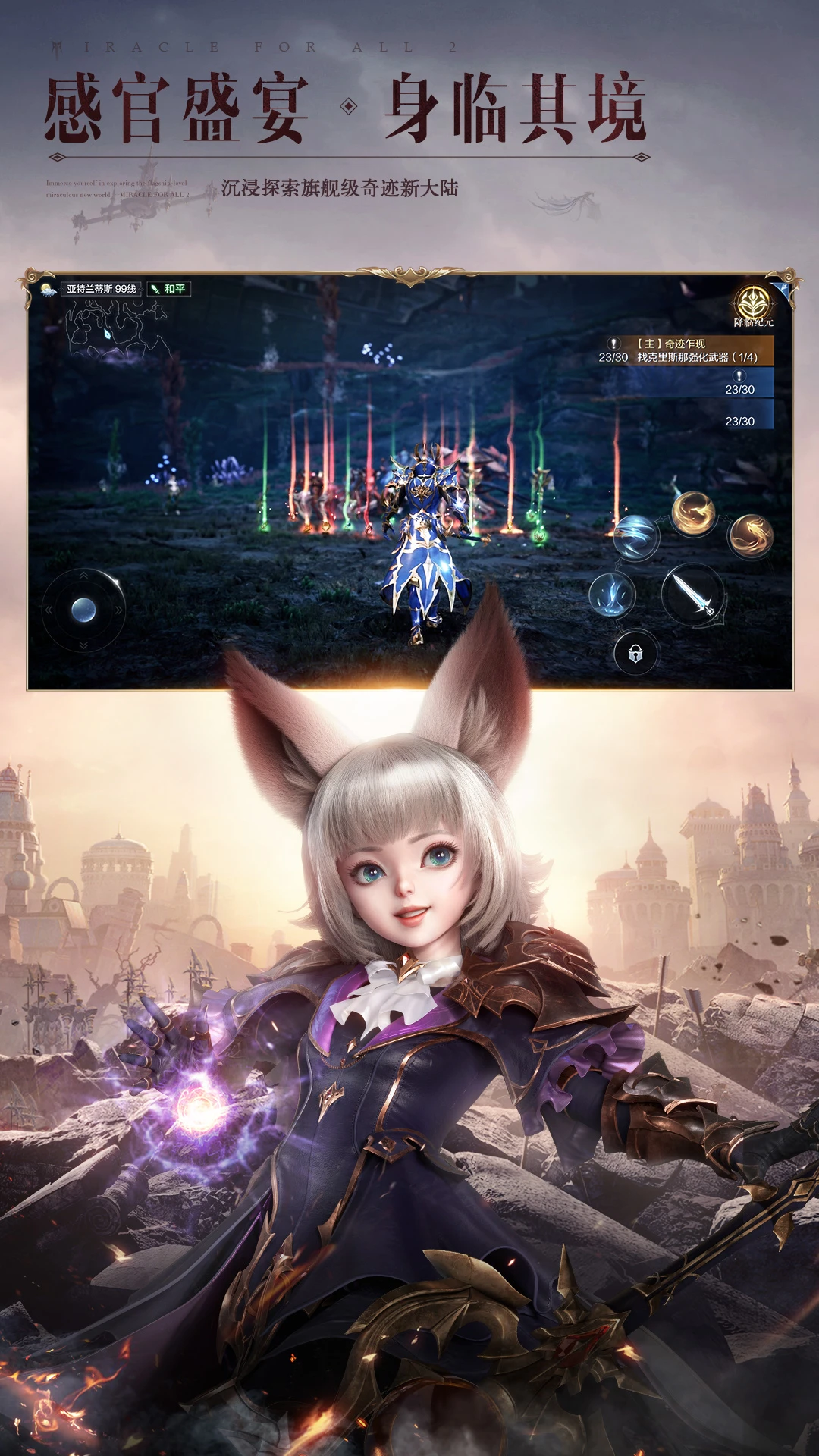 全民一起玩,才是真奇迹!《全民奇迹2》是一款腾讯旗舰级魔幻华丽手游。穿梭在UE4引擎演绎的华丽魔幻大世界里,身临其境般的沉浸体验。去感受,乘风翱翔展翅冲刺,掠过水面疾行在汹涌波涛中,体验海陆空三栖的无束缚探索;去战斗,具有魔法韵味的炫目技能,让每一次战斗都变成一场视觉盛宴;去成长,享受独特铠甲美学和流光羽翼的绚丽魅影。在这里,一起解禁你的无限魔幻想象。