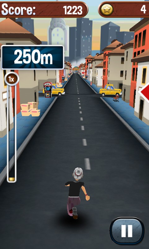 游戏通过创新的摇动手机及触屏操作方式,让玩家可以轻松控制老奶奶完成狂奔、跳跃或急转弯等动作;