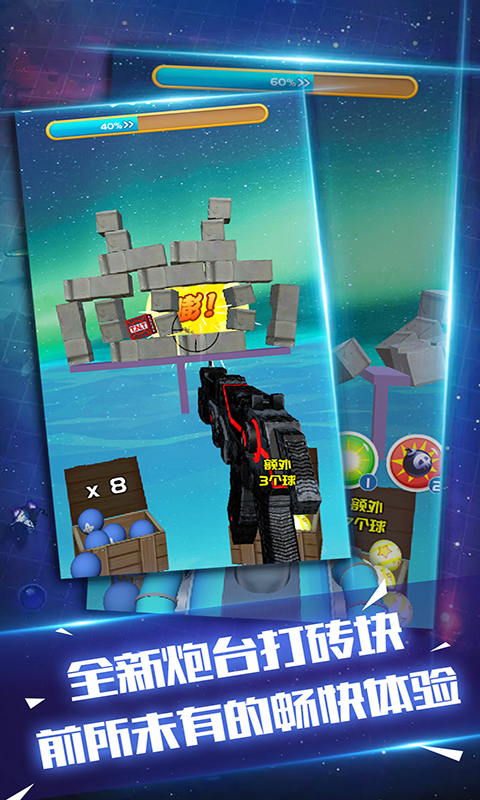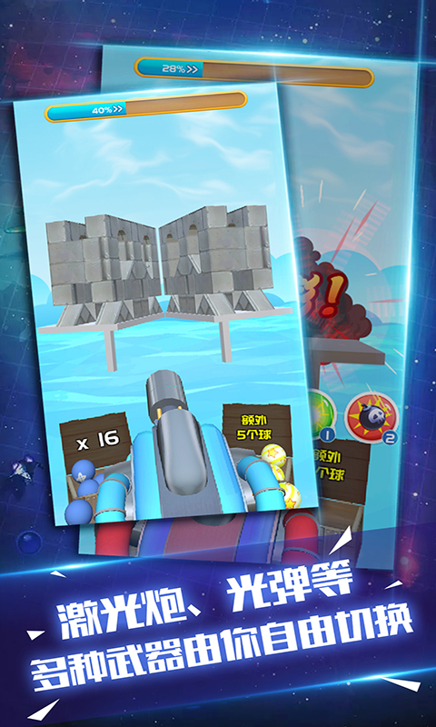 游戏设置了丰厚的奖励机制,玩家达到特定分数即可获得相应奖励,等级越高奖励越诱人。通过游戏内轻松获得的钻石,可以购买各种炫酷皮肤来装扮你的炮弹。多样化的炮弹造型设计,包括激光炮、光弹等多种武器类型,玩家可以根据喜好自由切换,体验不同的打击效果。