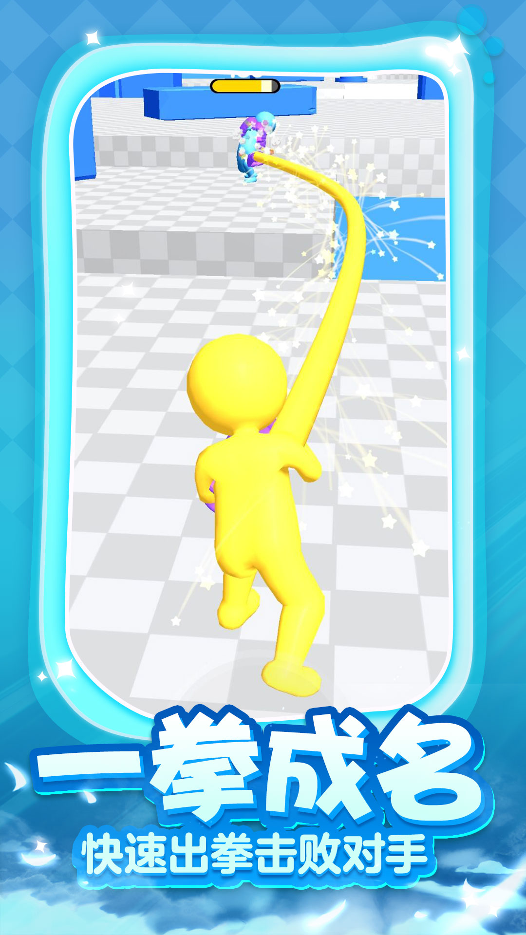 《一拳成名》是一款充满魔性乐趣的休闲动作游戏,玩家将操控一个拥有超长手臂的橡皮人角色,通过滑动屏幕控制拳头方向,将敌人一个个击飞。游戏最大的特色在于橡皮人那可以无限延伸的手臂,玩家需要精准计算出拳角度和力度,结合地形机关完成各种搞笑又解压的打击。简洁明快的画风搭配流畅的操作手感,让每一次出拳都充满爽快感,无论是想放松心情还是挑战高分,这款游戏都能带来独特的游戏体验。