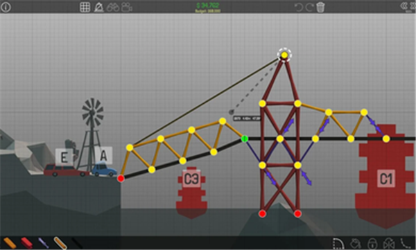 十米简桥是入门关卡,重点掌握基础支撑结构;新建斜坡需要计算最佳坡度角度;钢铁大桥考验金属材料的运用技巧;十四米天桥要注意跨度与支撑的平衡;检查点关卡需设置中途支撑柱;首个吊桥要合理配置悬索系统;出租车任务有特殊载重要求;绳索支撑关卡要善用拉力原理;预算削减需在有限资源下完成建造;首次飞跃则要设计具有弹性的跳板结构。每个关卡都暗藏设计巧思,建议多尝试不同方案,有时最简结构反而最有效。