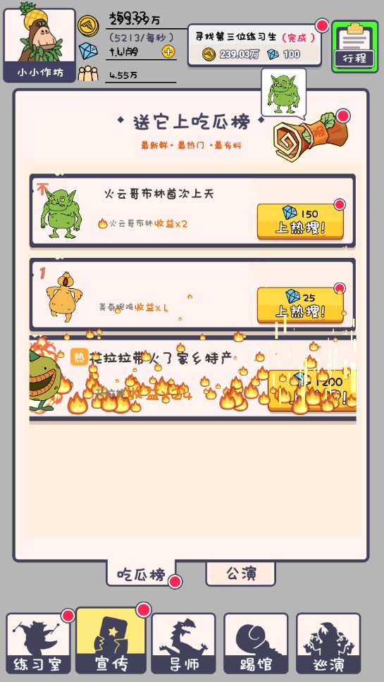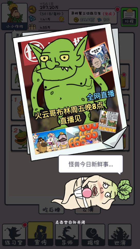 游戏画面采用可爱治愈的风格,每个怪物练习生都拥有独特的外形和个性。从呆萌的鸭嘴兽到酷炫的机械怪,各种造型让人忍俊不禁。游戏特别注重培养系统的深度,提供多种训练方式和表演舞台,让玩家可以全方位培养自己的练习生。此外,游戏还邀请了一流导师加盟,为你的练习生提供专业指导。