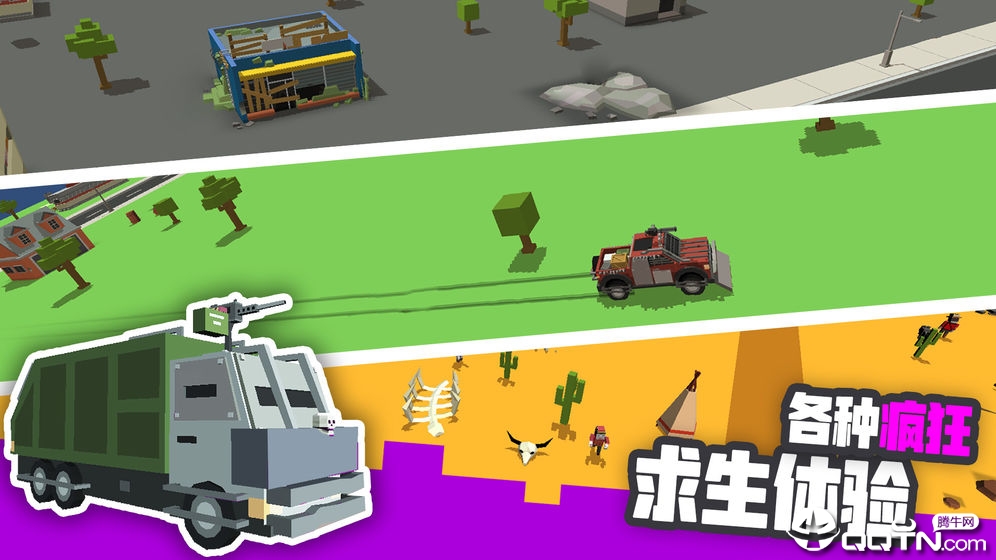 游戏采用随机生成的场景和无限挑战模式,为每次游戏都带来全新的体验。玩家需要时刻注意战车的汽油储备和角色的生命值,一旦耗尽就会导致游戏结束。游戏中有多种补给道具随机出现,包括生命值恢复、汽油补充、金币奖励等,这些道具将成为你在险境中扭转战局的关键。