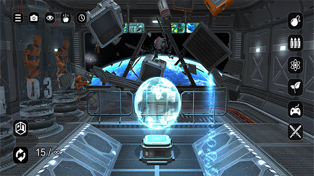 游戏主界面设计简洁明了,左侧为不同风格的房间选择区,右侧则是时间记录和破坏统计功能。中央区域是核心操作区,包含瞄准辅助、重力控制和时间调节功能。在武器选择方面,游戏提供了丰富多样的破坏工具,从基础的手枪到威力巨大的冲锋枪应有尽有。特别值得一提的是炸弹图标下隐藏着多种爆炸物选择,包括常规手雷、燃烧瓶等,每种武器都能带来截然不同的破坏效果。玩家只需点击底部选择的武器,再点击想要破坏的位置,就能立即释放破坏力,享受摧毁的快感。
