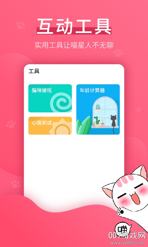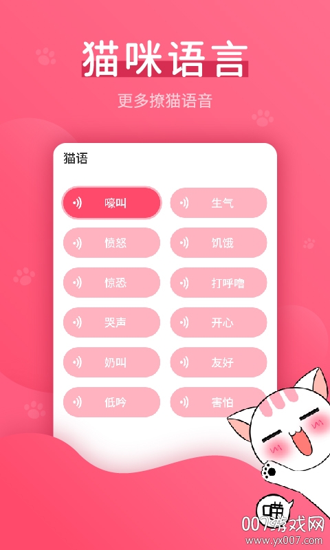 【猫咪心情测试】通过分析猫咪爪子的力度变化,结合叫声频率,准确判断猫咪当前的情绪状态,让主人随时掌握爱猫的心理变化。【人猫交流】采用先进的声纹识别技术,将人类语言转化为猫咪能理解的叫声,让您的爱宠真切感受到主人的关怀。【猫语翻译】通过收集大量猫咪叫声样本,精准翻译猫咪的各种叫声,帮助主人理解猫咪的需求。【逗猫训练】提供专业的训练指导,通过声音刺激引导猫咪完成指定动作,培养良好的行为习惯。