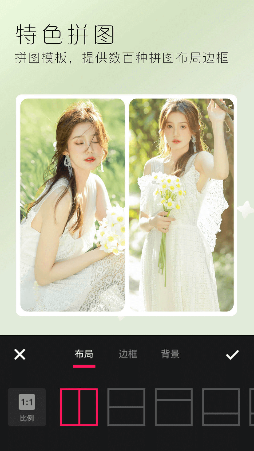 故事拼图:海量丰富的时尚拼图模板,独家智能水印,拼出你的故事心情。支持自定义布局和间距调整,让拼图创作更加自由灵活。