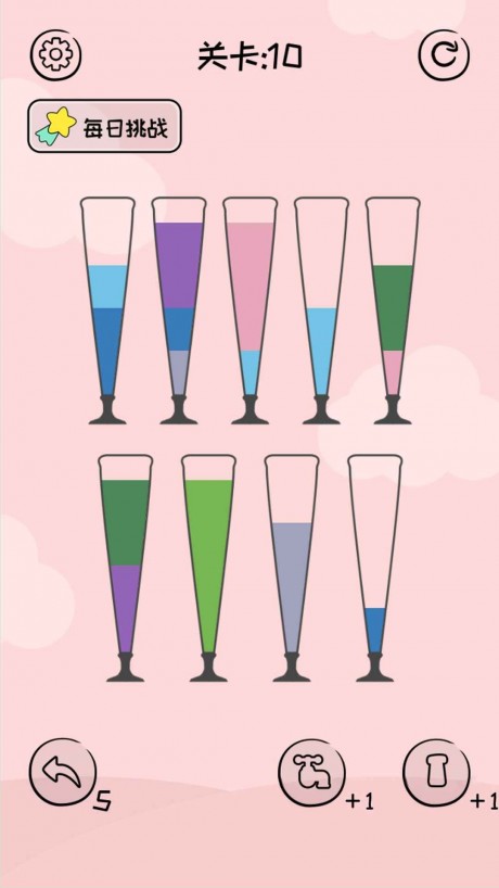 只有玻璃上有足够的空间才可以加水,否则很容易卡住并直接宣告失败。玩家需要仔细观察每个试管的容量和液体分布情况,合理规划倒液顺序。游戏采用直观的触控操作,只需轻点屏幕就能完成液体转移,操作简单但策略性十足。玩家可以体验越来越难的关卡,每个关卡都需要仔细思考下一步行动,虽然操作简单但通关需要智慧。