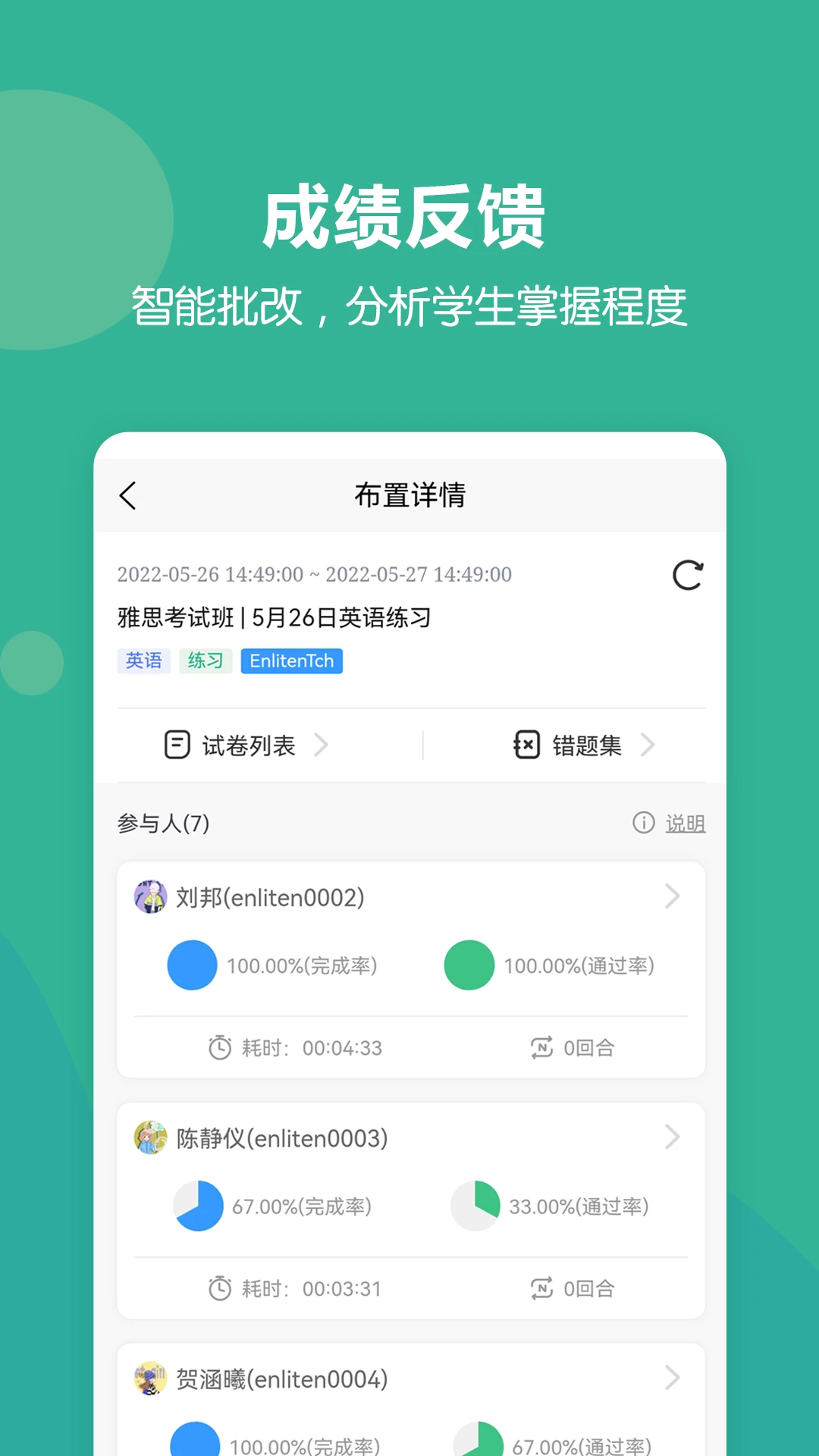 实时学情监控:教师可随时查看学生作业完成进度、正确率等关键指标,掌握班级整体学习状况。