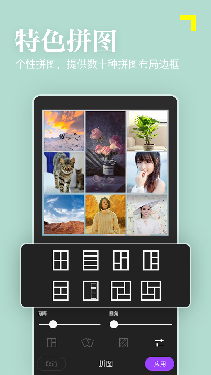 -可将多张照片编辑,支持最多9图拼接,自由调整版式与间距