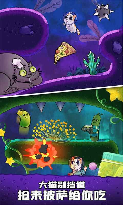 游戏的故事背景设定在神秘的太空世界,玩家将跟随火箭猫一起探索未知的星际领域。在冒险过程中,你不仅要躲避各种危险,还要收集尽可能多的小鱼干。这些小鱼干不仅可以用来兑换强力装备,还能解锁更多有趣的游戏内容。