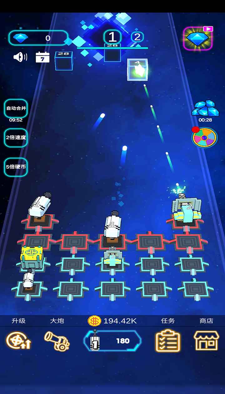游戏的核心战斗系统极具特色,将传统塔防与即时战略完美结合。玩家可以在自动射击和手动瞄准间自由切换,通过精准操作实现集火打击。丰富的合成系统让玩家能够将两个基础炮塔融合为更强大的武器,而多样化的子弹效果则为战斗增添了无限可能。
