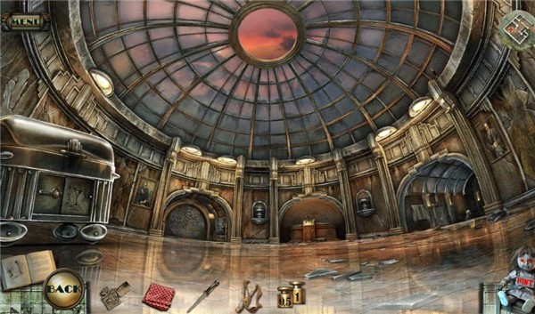 游戏主界面左侧提供快捷菜单按钮,方便玩家随时暂停游戏或查看设置。左下角的书本图标记录了所有调查过的故事情节和解谜线索。返回按钮让玩家可以快速回到上一个场景。向导功能详细记录了所有解谜流程。右侧界面中,地图功能清晰标注了所有可探索区域和当前所在位置。右下角的提示娃娃可以帮助玩家找到可互动的物品,在小游戏中也能提供跳过功能。底部道具栏显示当前收集的所有物品。