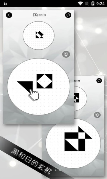 -两个三角形重叠的时候,重叠部分会变成白色,三个三角形重叠的时候,重叠那个碟部分会变成黑色。这种颜色变化机制让解谜过程充满惊喜和乐趣。
