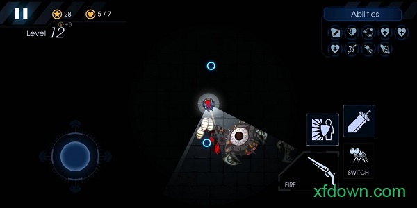 独特的黑暗视野系统是游戏的核心机制,玩家只能依靠有限的灯光范围观察周围环境,左侧屏幕控制射击方向,右侧负责武器切换和技能使用。
