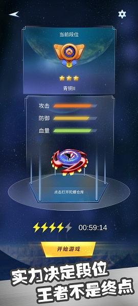 独特的能量管理系统,所有技能都需要消耗能量,陀螺强度影响能量恢复速度。完善的段位升降机制,胜利获得星星提升段位,失败则会降级。需要精准操控陀螺躲避敌方攻击,考验玩家的反应能力。三大特色技能各具特色:火球造成高额伤害,冰冻控制敌人行动,无敌提供短暂保护。暴击系统增加战斗变数,通过快速点击屏幕可触发致命一击,逆转战局。