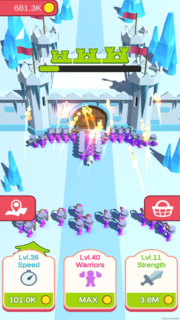 空闲攻城槌的核心玩法是利用攻城槌进行攻城战斗,是一款轻松有趣的挂机游戏。玩家只需打开游戏,系统就会自动开始积累金币,无需复杂操作。随着金币的不断积累,你可以逐步升级攻城槌的威力,同时强化橡皮人士兵的各项能力,包括攻击力、防御力和移动速度等。当你的军队足够强大时,就能加速攻破敌方城堡,解锁新的关卡和挑战。游戏节奏轻松,但策略性十足,玩家需要合理规划资源,才能在最短时间内取得胜利。