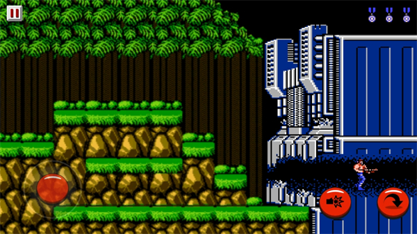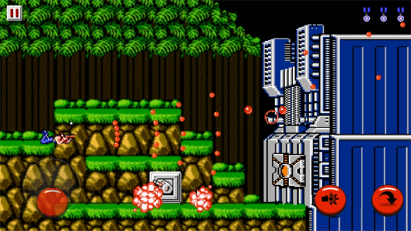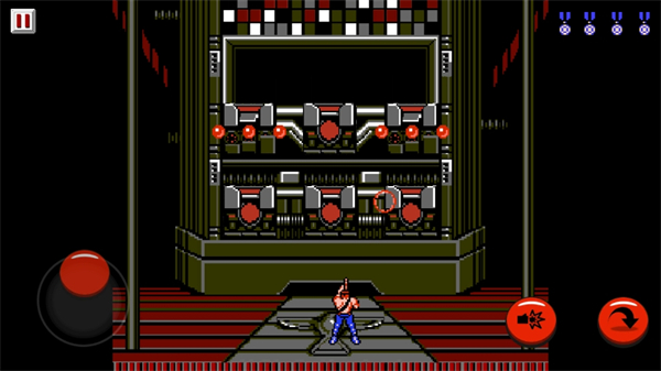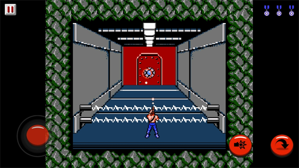 游戏开始后,玩家需要点击"PRESS START"进入战斗。操作界面采用经典的虚拟按键设计,左侧方向键控制移动,右侧按键负责射击和跳跃。游戏关卡设计精妙,每个场景都布满了敌人和致命陷阱,玩家需要时刻保持警惕。特别值得一提的是,场景中随机出现的武器道具系统为游戏增添了更多变数,不同武器拥有独特的攻击特性,合理利用这些武器是通关的关键。游戏还保留了经典的30命秘籍,让新玩家也能体验到完整游戏内容。