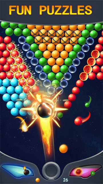 游戏简洁而刺激,玩家通过灵活控制屏幕消除相同颜色的泡泡以获得高分。独特的计分系统鼓励玩家创造连击效果。