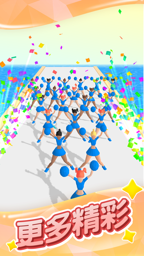游戏拥有令人惊艳的服装系统,提供上百种颜色组合和款式选择,让玩家可以尽情发挥创意,打造最具个性的啦啦队形象。在跑酷过程中,玩家需要收集散落在赛道上的啦啦队成员,通过不断扩大队伍规模来提升最终得分。游戏采用经典的跑酷玩法,但加入了独特的团队元素,当啦啦队员们穿着精心搭配的服装整齐划一地奔跑时,场面既壮观又有趣。