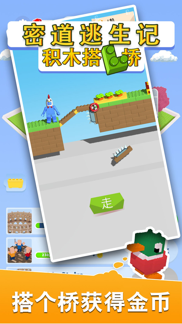 《密道记》是一款极具创意的益智解谜游戏,玩家需要通过选择正确的乐高积木,并将它们拖拽到指定位置,搭建出一座能够承受角色重量的桥梁。只有桥梁足够稳固,角色才能安全通过,并最终击败关卡BOSS,成功救出被困的小女孩。每通过一关,玩家都会获得丰厚的金币奖励,这些金币可以用来解锁更多样化的乐高积木配件,让你的桥梁设计更加丰富多彩,角色的外观也能随之个性化定制!