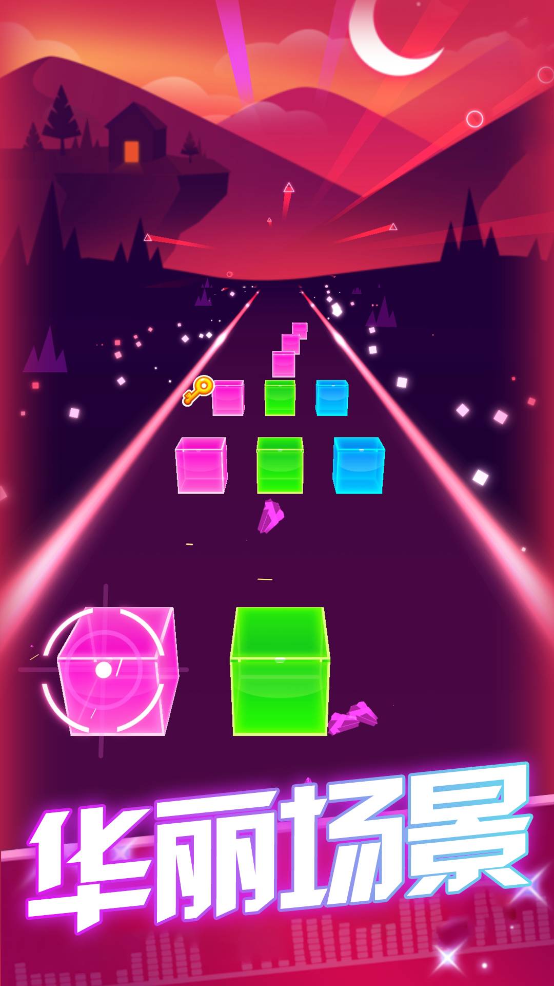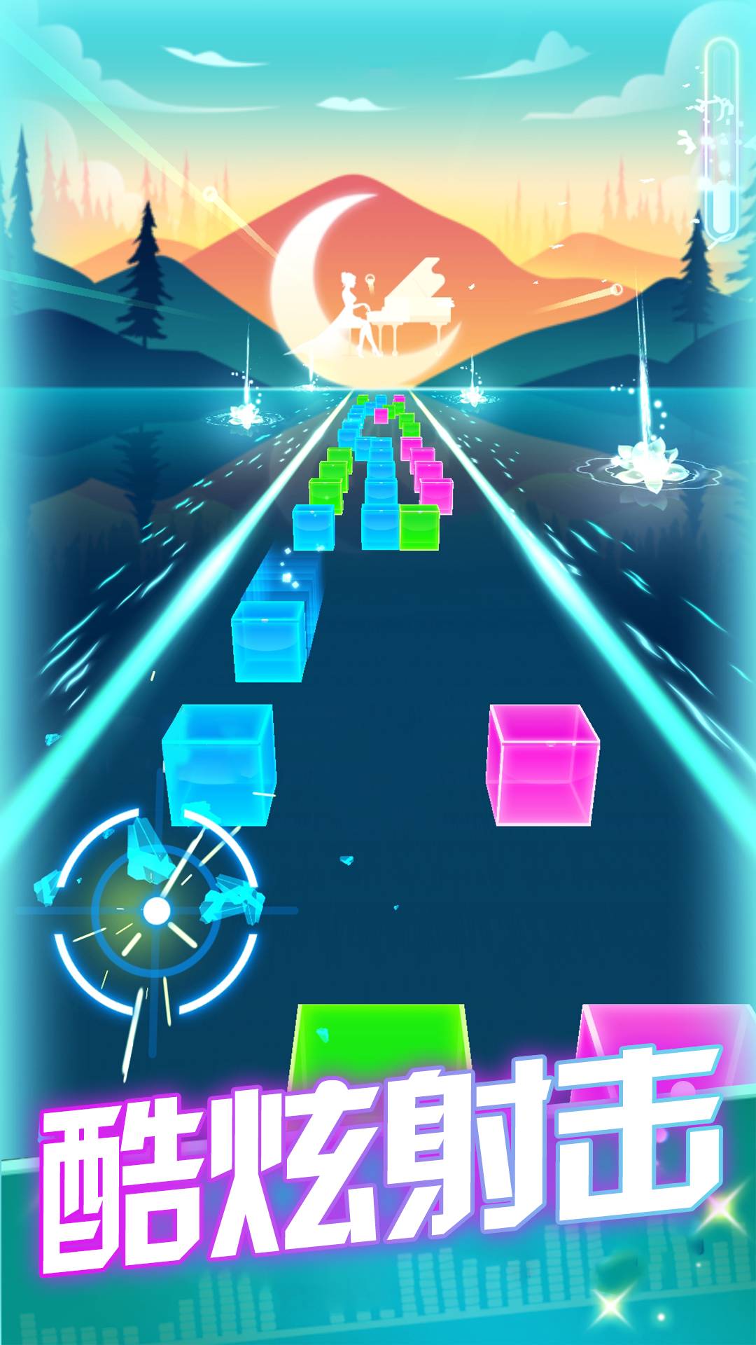 游戏的核心机制在于将传统射击游戏与音乐节奏完美结合。玩家需要根据背景音乐的节拍来判断最佳射击时机,每个方块都对应着特定的音符。当连续命中时,会触发华丽的连击特效并获得分数加成。游戏特别设计了"完美判定"系统,精确到毫秒级的操作将获得三倍分数奖励。此外,不同颜色的方块需要切换对应的武器进行射击,这种动态切换机制大大提升了游戏策略性。每首歌曲都经过专业音乐人精心编排,确保节奏与游戏玩法高度契合。
