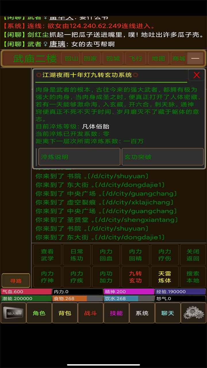 这款游戏以其宏大的世界观和自由度获得玩家一致好评。游戏地图规模惊人,包含数十个风格迥异的武林门派,每个门派都有完整的武学体系和独特文化。新手引导系统非常友好,老玩家都会热心帮助新人解答疑问。门派系统设计独具匠心,通过合并部分门派增加了武学搭配的可能性,让每个玩家都能创造出独特的战斗风格。虽然游戏框架遵循传统MUD模式,但对新手玩家特别照顾,简化了复杂操作的同时保留了深度玩法。游戏社区氛围良好,玩家之间经常组织各种活动,共同维护这个充满魅力的武侠世界。