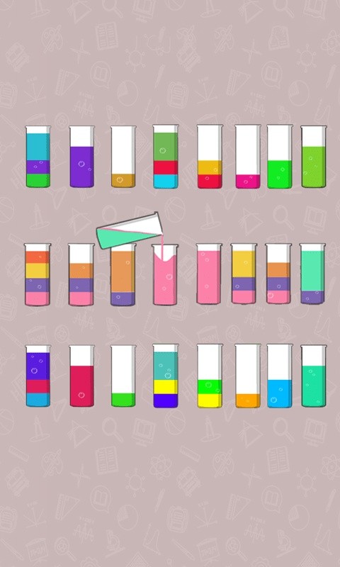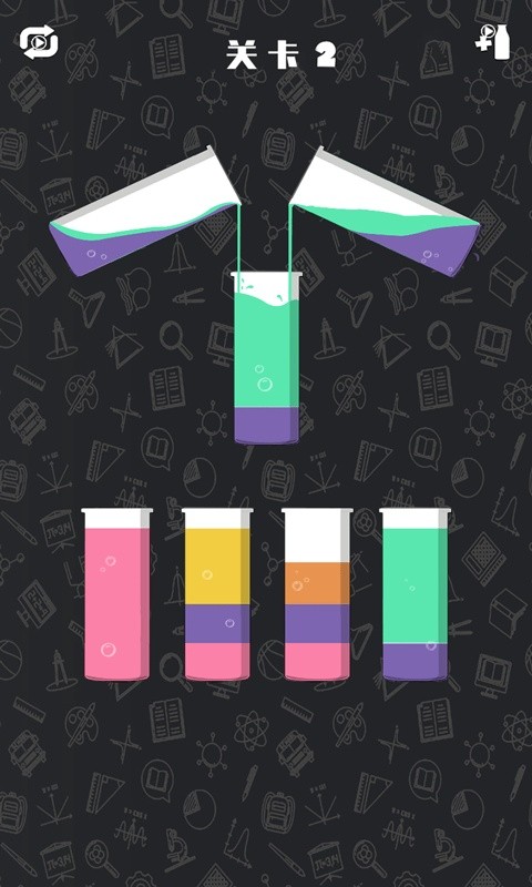 游戏核心在于掌握液体转移的黄金法则:同色相融,异色相斥。玩家需要像化学家般谨慎操作,通过长按控制倾倒力度,滑动调整倾倒方向,任何失误都可能导致液体污染。