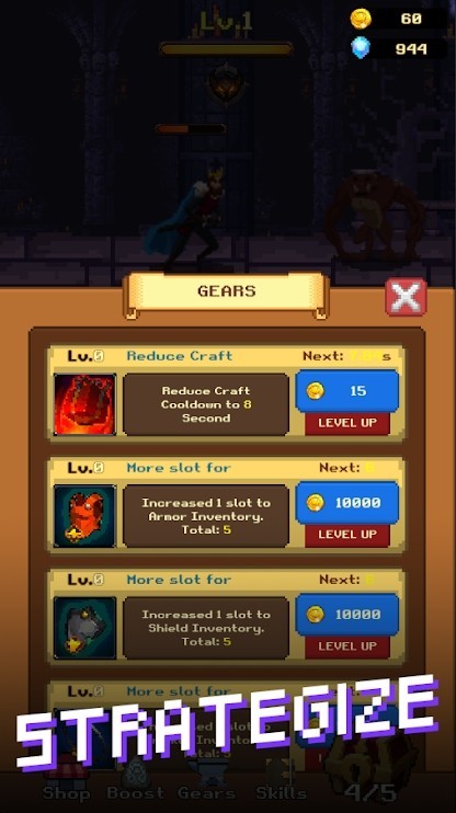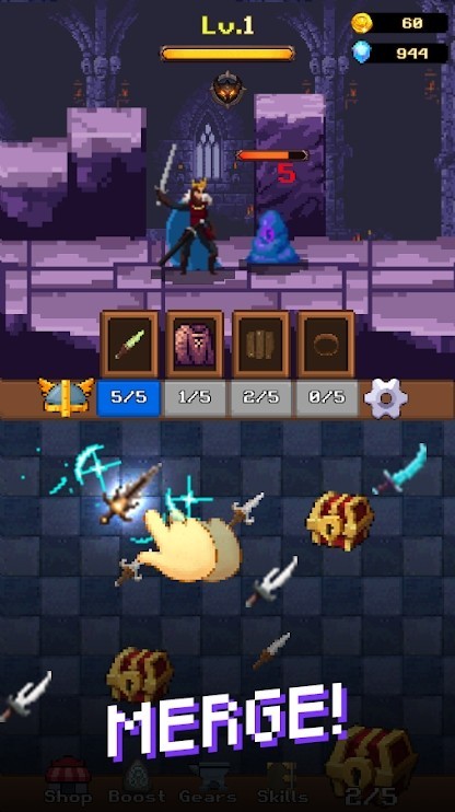本作完美融合了像素风格与合成闯关玩法,打造出独特的游戏体验。玩家可以点击宝箱获得武器,并通过合成系统提升装备品质。游戏以亚瑟王为主角,采用自动战斗模式,让玩家专注于策略制定。每次冒险最多可开启五个武器宝箱,合成后的装备可以装备给亚瑟王,显著提升其战斗能力,助你轻松应对各种挑战。