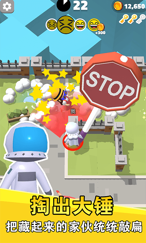 掏出大锤,把藏起来的家伙统统敲扁。寻找者可以使用各种搞笑道具,比如会放屁的坐垫、粘性泡泡糖等来捕捉目标。