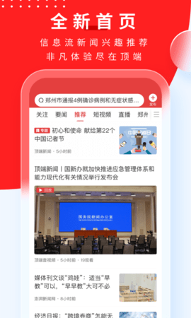 精心设置的频道分类,包括郑州本地、时政要闻、经济动态、短视频、直播等多个专区,方便用户快速定位感兴趣的内容。