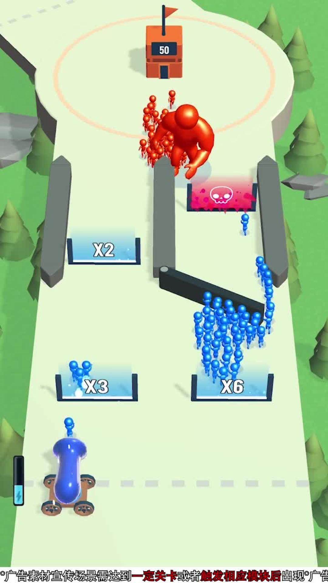 用你的大炮连续发射小兵,助你战斗,击破敌人的所有防线。游戏采用直观的触控操作,玩家可以自由调整发射角度和力度,精准控制小兵的落点位置。将人们带到倍增的大门上,以增加您的人群并占领所有基地!倍增门是兵力扩张的关键,需要优先占领战略要地。避开红色大门,然后推开红色人群,试图破坏您的进攻节奏!你可以聚集多少人?游戏会实时统计兵力对比,让玩家随时掌握战场态势。