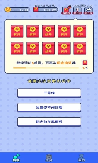 玩家可以通过猜歌、做任务等方式直接获取现金奖励,系统会根据歌曲难度给予不同额度的红包。通过猜歌、拆红包、做任务等方式获取金币奖励,当金币累积到10000个时就可以兑换10元现金,兑换比例公开透明。带有抽奖字样的特殊任务完成后可获得现金抽奖机会,中奖率高达80%。现金抽奖采用大转盘形式,奖金金额从0.3元到88元不等,每天都有免费抽奖机会。连续猜对歌曲会触发连对奖励机制,最高可享受5倍收益加成,通过观看短视频还能获得额外倍数奖励。猜错歌曲时可以选择观看广告复活一次,否则连对记录将清零。当账户余额达到10元、20元、50元等多个档位时,都可以申请提现到微信或支付宝,最快30秒到账。