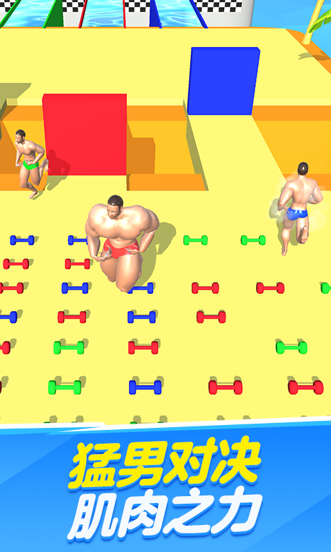 《猛男健身大作战》是一款充满力量与欢乐的跑酷游戏,玩家将扮演一位肌肉发达的猛男,在充满障碍的赛道上尽情狂奔。游戏采用夸张搞笑的画风,让玩家在轻松愉快的氛围中体验健身的乐趣。通过收集与自己颜色相同的哑铃来增强肌肉能量,解锁更多强力技能,突破重重障碍。随着关卡的推进,挑战难度逐渐升级,玩家需要灵活操作,巧妙躲避对手的撞击,同时利用强壮的体格推开障碍物,向着终点冲刺。游戏还提供了多种趣味玩法,让每一次奔跑都充满新鲜感。