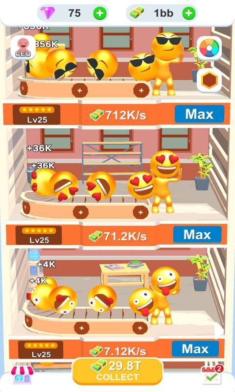 《放置表情工厂IdleEmojiFactory》是一款集经营、模拟、策略于一体的休闲游戏。游戏以表情包制作为主题,让玩家体验从一个小作坊发展到全球知名表情工厂的全过程。你需要精心规划生产线,合理安排资源,同时还要关注市场动态,确保你的表情包能够获得最大收益。随着工厂规模的扩大,你还能解锁更多稀有表情配方,让你的产品更加丰富多彩。