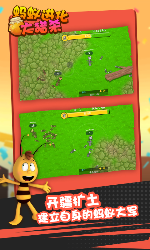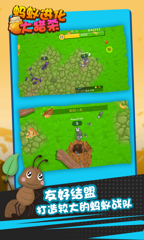 在广阔的竞技场中搜寻食物资源,每份资源都能让你的蚂蚁军团变得更加强大,成长没有上限。