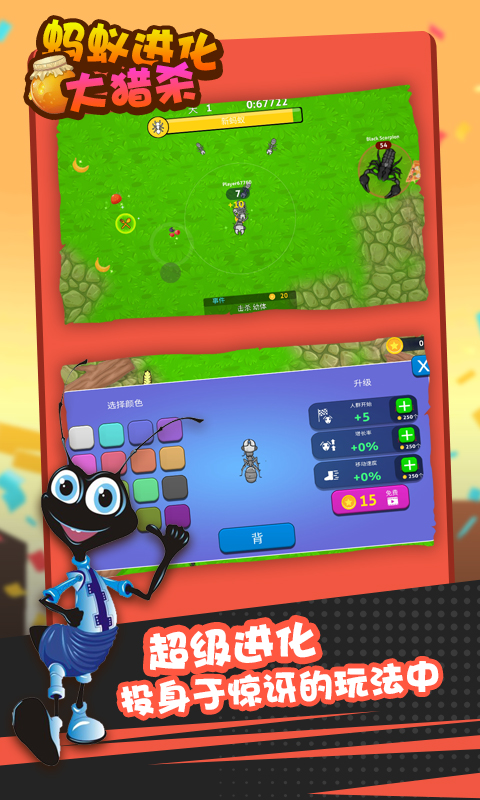 游戏提供丰富的自定义选项,玩家可以选择心仪的颜色主题,并通过升级系统强化蚂蚁军团,随时准备迎接新的挑战。