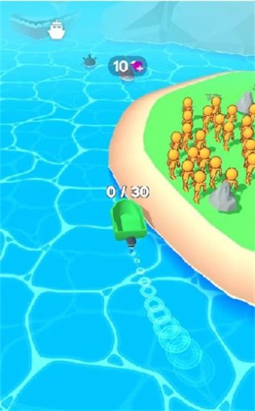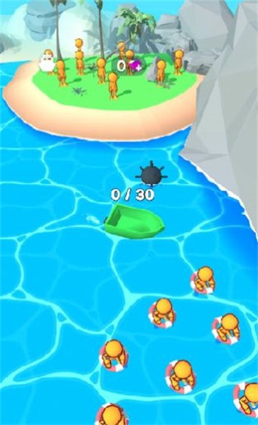 摇杆操控小船移动,小船的初始容量是10人,在海中救出十个人后就去岸边将人放下,注意不要超载;